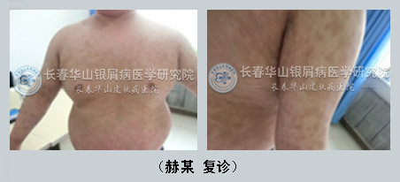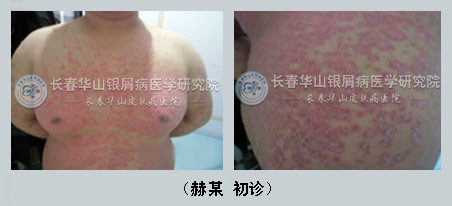 【患者自述】在赫某16岁的时候就患上牛皮癣了,起初是扁桃体化脓高烧,高烧后前胸和肚子加手臂就起了米粒样的丘诊,后去医院被确认为牛皮癣,家长焦急万分四处求医,看了好多医院,都是治疗好转,停药又复发,久而久之使全身均出现皮诊。后来父母多方打听,于2012年10月24日来到长春华山银屑病医学研究院,就抱着一线希望来治疗。